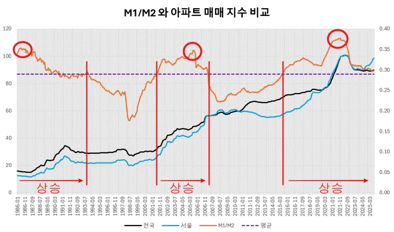 M1/M2의 역사적 평균값은 0.29이고 기록적으로 높았던 값은 0.35(86년), 0.35(05년), 0.37(21년 말)입니다. 저희가 86년은 모르겠지만, 아파트 역사적 고점이었던 21년 말은 기억하실 겁니다.( 물론, 25년 현재 서울 중심지는 이미 전고점을 진작에 뚫고 신고가를 경신했으나 그 외 지역은 그렇지 못한 곳도 많습니다.)
