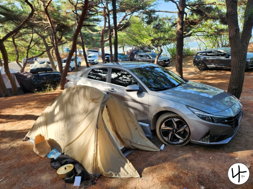 저희도 해변가에 설치하고 싶었는데 자리가 없어 아쉬운대로 바다가 보이는 위치에 텐트를 설치했습니다. 근데 저희가 간과한 게 하나 있더라고요. 당시 5월이었는데 아직까진 바닷바람이 매서워서 너무 춥더라고요. 그래서 좀 안쪽으로 위치를 옮기고 자동차를 바람막이 삼아 주차했습니다. 그래도 혹시 몰라 겨울 이불을 챙겼는데 안 챙겼으면 진짜로 얼어 죽을 뻔했습니다. 바닷가라 춥다는 걸 꼭 명심하셔야 합니다.
