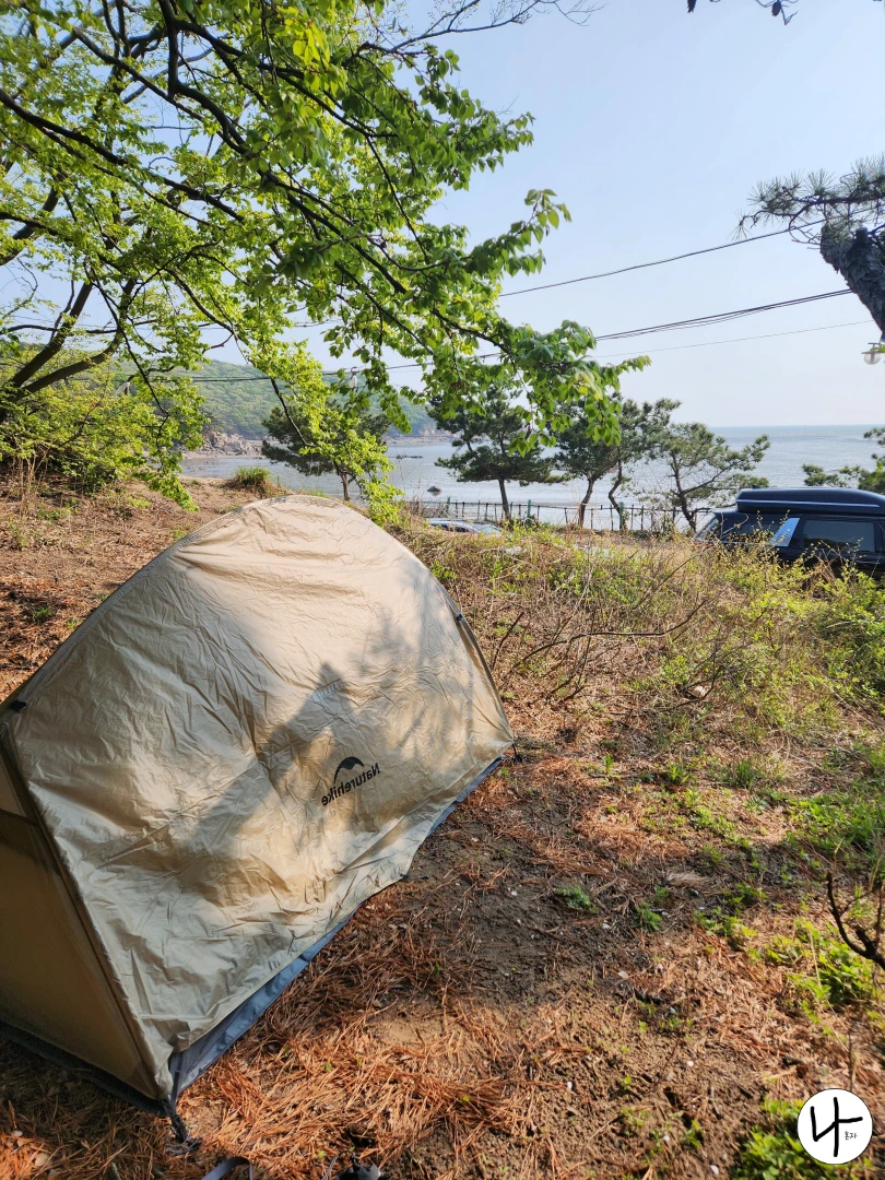 저희도 해변가에 설치하고 싶었는데 자리가 없어 아쉬운대로 바다가 보이는 위치에 텐트를 설치했습니다. 근데 저희가 간과한 게 하나 있더라고요. 당시 5월이었는데 아직까진 바닷바람이 매서워서 너무 춥더라고요. 그래서 좀 안쪽으로 위치를 옮기고 자동차를 바람막이 삼아 주차했습니다. 그래도 혹시 몰라 겨울 이불을 챙겼는데 안 챙겼으면 진짜로 얼어 죽을 뻔했습니다. 바닷가라 춥다는 걸 꼭 명심하셔야 합니다.